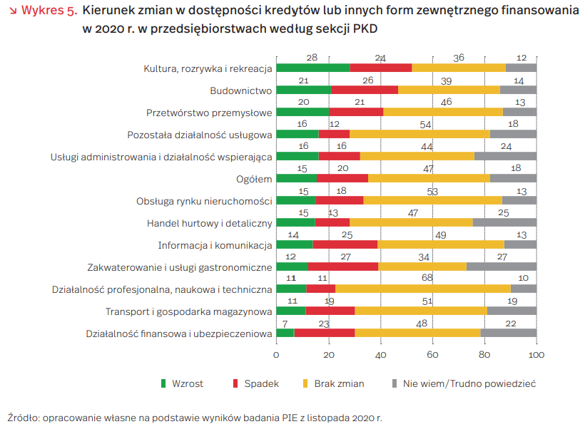 Z badania PIE (n=1000 firm, metoda: CATI, termin badania: listopad 2020 r.) wynika, że w 2020 r. tylko 15 proc. firm dostrzegło poprawę dostępności zewnętrznego finansowania, 20 proc. pogorszenie, a blisko połowa nie zaobserwowała zmiany. Na wzrost dostępności wskazało najwięcej firm prowadzących działalność w zakresie kultury, rozrywki i rekreacji (28 proc.), przedsiębiorstw budowlanych (21 proc.) i przetwórstwa przemysłowego (20 proc.). Natomiast pogorszenie dostępności do zewnętrznego finansowania odczuły przede wszystkim firmy prowadzące działalność związaną z zakwaterowaniem i usługami gastronomicznymi (27 proc.) (wykres 5).