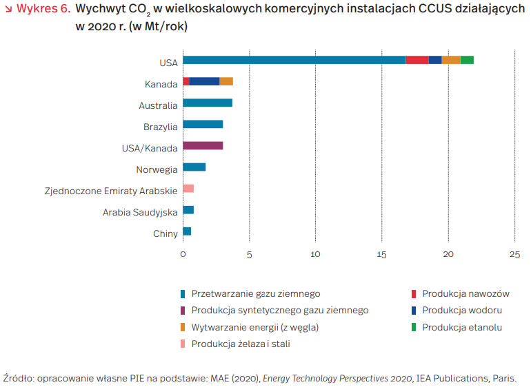 Zwiększone inwestycje i zaostrzone cele klimatyczne tworzą nowe warunki dla rozwoju technologii wychwytu, składowania i utylizacji CO2 (Carbon capture, utilisation and storage – CCUS). Międzynarodowa Agencja Energii (MAE) podała, że od 2017 r. zostały ogłoszone plany budowy ponad 30 komercyjnych instalacji CCUS, głównie w Stanach Zjednoczonych i Europie. W Stanach Zjednoczonych w 2018 r. zreformowano ulgę podatkową Section 45Q zwiększając środki do 50 USD na tonę magazynowanego CO2 lub 35 USD na tonę zutylizowanego CO2. W unijnym funduszu innowacji (10 mld EUR) przewidziano możliwość wspierania projektów CCUS od 2020 r. W Norwegii realizowany będzie projekt Longship z instalacją wychwytu CO2 z obiektów przemysłowych i składowania pod szelfem morskim o całkowitym koszcie 25 mld NOK (11,4 mld PLN), w tym dotacja państwa ma wynieść 16,8 mld NOK (7,7 mld PLN).