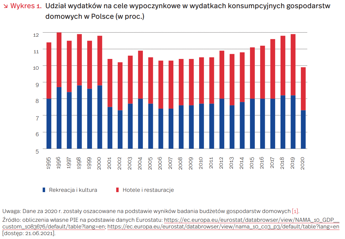 Udział wydatków na cele wypoczynkowe w Polsce ma potencjał do szybkiego wzrostu w najbliższych latach. Dochodowa elastyczność popytu na dobra służące wypoczynkowi w państwach UE wynosi 1,34. Oznacza to, że 10 proc. wzrostowi dochodu kierowanego na wydatki konsumpcyjne towarzyszy 13,4 proc. wzrost wydatków na cele wypoczynkowe. Polska lokuje się poniżej wyznaczonej linii trendu, co sugeruje, że nasze gospodarstwa domowe mogłyby przeznaczać wyższy odsetek swych wydatków na cele wypoczynkowe w ramach budżetu, którym dysponują. Jest więc potencjał nie tylko do zniwelowania strat pandemicznych, ale i do powrotu na ścieżkę ekspansji obserwowanej w latach wcześniejszych.
