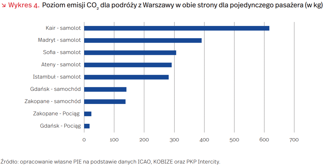 Niższa liczba wyjazdów zagranicznych może oznaczać duże korzyści dla środowiska naturalnego. W przypadku 3-osobowej rodziny z Warszawy podróż na Pomorze lub w polskie góry przekładać się będzie na emisję 60-80 kg CO2, jeśli wybierze podróż pociągiem i ok. 140 kg CO2 przy użyciu transportu samochodowego. Podróż zagraniczna samolotem dla 3 osób to w przypadku najpopularniejszych destynacji turystycznych z 2019 r. od blisko 850 kg do ok. 1850 wyemitowanych kg CO2 . Oznacza to, że wybór polskiej zamiast egipskiej plaży może w tym przypadku zaoszczędzić środowisku ponad 1,5 tony CO2.