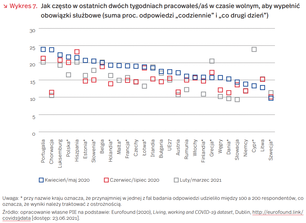 Tendencja ta zmieniała się jednak w czasie – najwyższy odsetek pracujących „po godzinach” odnotowany był w początkowym okresie pandemii. W Portugalii, Chorwacji, Luksemburgu, Polsce i czterech innych krajach przynajmniej jedna piąta pracowników deklarowała pracę w czasie wolnym. W trzeciej fali badania prowadzonego przez Eurofund, wiosną 2021 r., nieco mniej osób deklarowało pracę po godzinach – dla Polski było to 16,5 proc., a więc o 5,2 pkt. proc. mniej niż rok wcześniej.