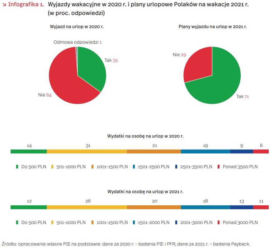 W 2021 r., według Payback, najwięcej badanych (26 proc.) wskazało, że na urlop przeznaczy między 501 PLN a 1000 PLN na osobę. Mniej osób (20 proc.) wyda od 1001 PLN do 1500 PLN, a 18 proc. – od 1501 PLN do 2000 PLN. W ubiegłym roku, według badań PIE i PFR, grupa osób, które wydały od 501 PLN do 1000 PLN na osobę również była najliczniejsza (31 proc.). W 2021 r. wzrósł jednak udział osób, które planują wydatki w wyższych przedziałach (infografika 1). Może to być związane z ogólną poprawą sytuacji gospodarczej w kraju, a co za tym idzie bytowej wielu rodzin, ale również z braniem pod uwagę ewentualny wzrost cen za usługi turystyczne.