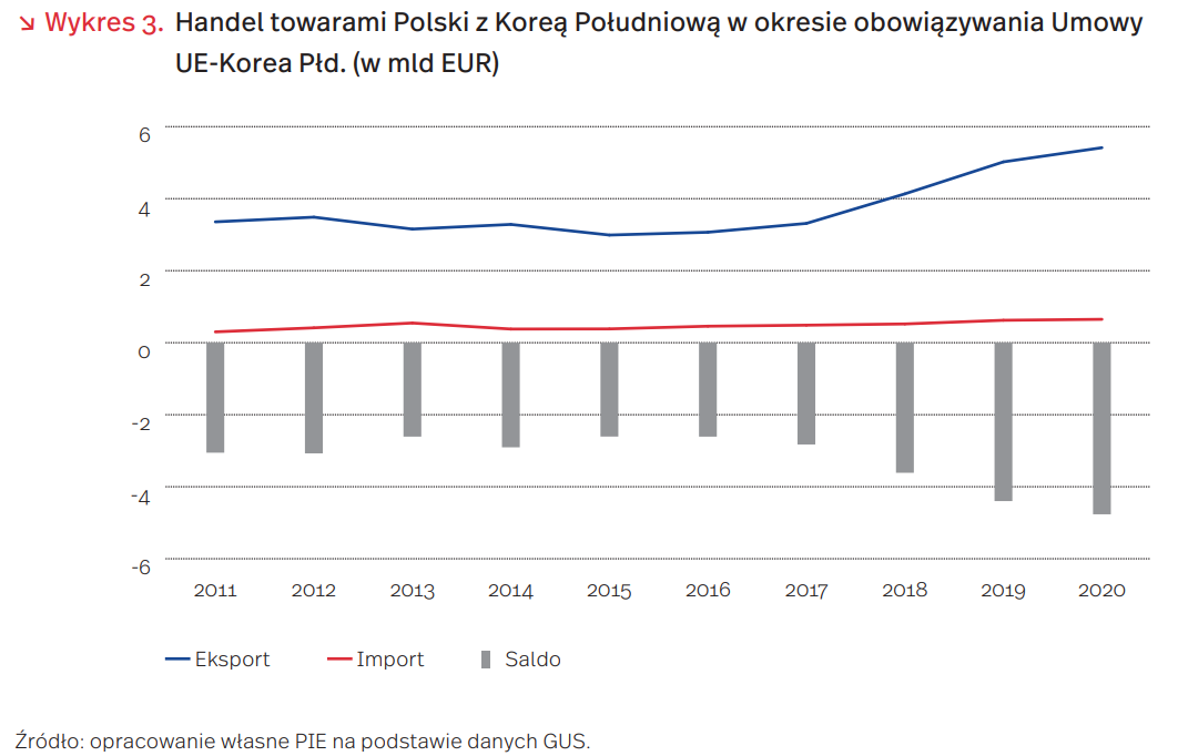 Udział Korei Płd. w polskim eksporcie towarów pozostaje marginalny – w 2020 r. wyniósł zaledwie 0,27 proc., choć od 2010 r. wzrósł o 0,1 pkt. proc. Natomiast udział Korei Płd. w imporcie jest 10-krotnie wyższy i wyniósł w 2020 r. 2,4 proc. (czyli o 0,35 pkt. proc. mniej niż w 2010 r.). Oznacza to, że import z Korei Płd. rósł wolniej niż wartość importu z innych kierunków.