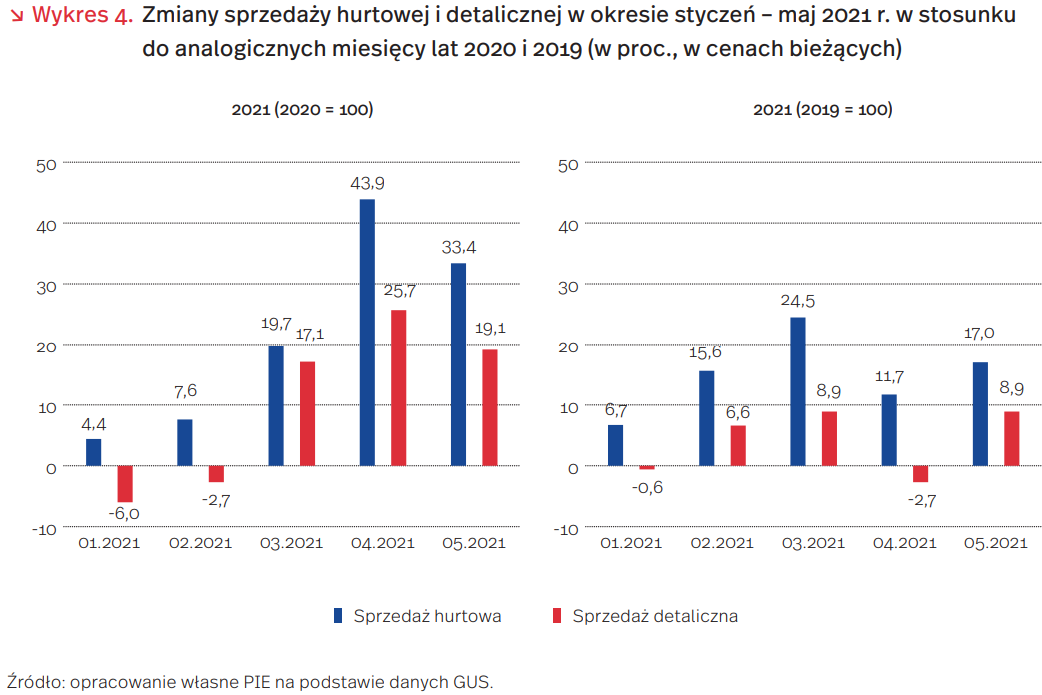 W pierwszych 5 miesiącach 2021 r. sprzedaż w handlu hurtowym wykazywała wyższą dynamikę wzrostu niż w handlu detalicznym r/r. (wykres 4). W styczniu i lutym wzrostom sprzedaży hurtowej odpowiednio o 4,4 proc. i 7,6 proc. towarzyszyły spadki sprzedaży handlu detalicznego (odpowiednio o 6 proc. i 2,7 proc.). W kolejnych miesiącach duże wzrosty wystąpiły zarówno w przypadku handlu hurtowego, jak i detalicznego, ale wyższe hurtowego. Tak wysokie dynamiki to efekt niskiej bazy. W kwietniu i maju 2020 r. zanotowano głębokie spadki sprzedaży handlu hurtowego i detalicznego, a detalicznego także w marcu, w wyniku I fali pandemii. Jeśli uwzględni się zmiany podczas dwóch lat (2019 do 2021), to również znacznie wyższa dynamika sprzedaży miała miejsce w handlu hurtowym niż w detalicznym. W okresie od marca do maja 2021 r. wystąpiły znaczne wzrosty sprzedaży w stosunku do analogicznych miesięcy 2019 r., z wyjątkiem sprzedaży detalicznej w kwietniu, która zmniejszyła się o 2,7 proc. W miesiącu tym wystąpił bowiem szczyt III fali pandemii.