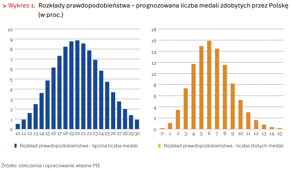 Analizie poddaliśmy wyniki komitetów olimpijskich począwszy od Olimpiady z 1980 r. w USA. Przygotowaliśmy model statystyczny oparty na rozkładzie Poissona, który opisuje prawdopodobieństwo zdobycia danej liczby medali. Według jego oszacowań, Polacy z 70-proc. prawdopodobieństwem zdobędą od 4 do 8 złotych medali. W przypadku łącznej klasyfikacji będzie to 15-24 krążków. Rozkłady prawdopodobieństwa przedstawiamy na wykresie 1.