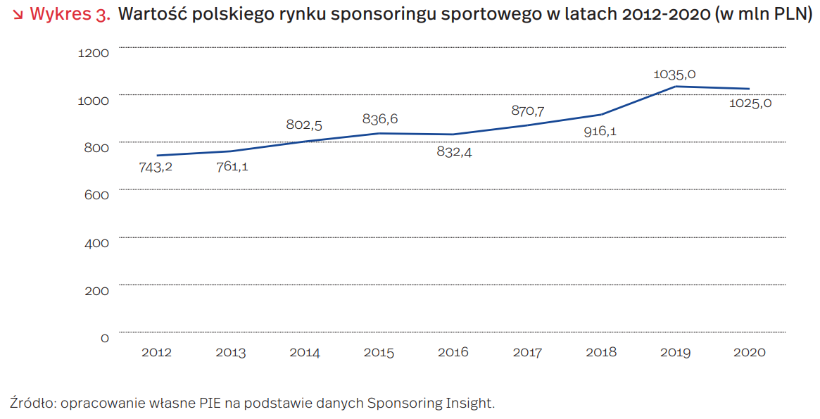 Pandemia zahamowała rozwój rynku sponsoringu sportowego w Polsce, ale jak można sądzić, tylko przejściowo. Wartość tego rynku wzrosła z 743,2 mln PLN w 2012 r. do 1035 mln zł w 2019 r. (wykres 3). W 2020 r. zmniejszyła się tylko nieznacznie do 1025 mln PLN, mimo odwołania wielu imprez sportowych i zamknięcia stadionów z powodu lockdownów. W ostatnich latach w polskim rynku sponsoringu wzrósł udział branży paliwowej (z 17,5 proc. w 2018 r. do 26 proc. w 2020 r.), którą reprezentuje PKN Orlen oraz PGNiG i Lotos. Drugą po paliwowej branżą najbardziej zaangażowaną we wspieranie sportu jest energetyka, na czele z PGE, która jest sponsorem tytularnym stadionu PGE Narodowy, zespołu PGE Skra Bełchatów i ligi żużlowej PGE Ekstraligi.