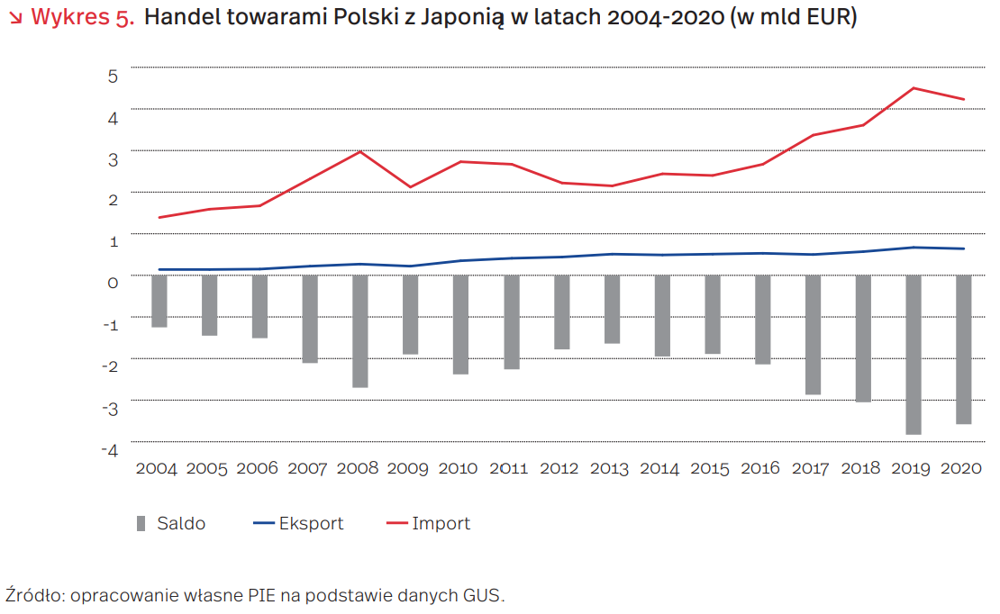 Wśród pozaunijnych kierunków polskiego eksportu Japonia zajęła w 2020 r. dopiero 19. miejsce, a jej udział w eksporcie Polski poza UE wyniósł zaledwie 1 proc. Według danych GUS, w 2020 r. wyeksportowano towary o wartości 644 mln EUR, a wartość polskiego importu z Japonii wyniosła 4227 mln EUR. Polska notuje zatem deficyt obrotów towarowych z Japonią, który w ostatnich latach się pogłębia.