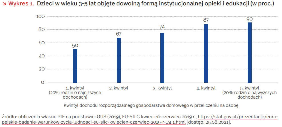 W Polsce dzieci z biedniejszych rodzin korzystają z opieki przedszkolnej w mniejszym stopniu niż dzieci z rodzin bogatszych. Ogółem, 70 proc. dzieci w wieku 3-5 lat jest objętych formalną opieką i edukacją (statystyka ta – policzona na podstawie danych z badania EU-SILC za 2019 r. – obejmuje wszystkie formy formalnej opieki nad dziećmi, w dowolnym wymiarze czasu). Wśród 20 proc. najbogatszych rodzin (5. kwintyl) odsetek ten wynosi 90 proc. Jednak w 20 proc. rodzin o najniższych dochodach na osobę (1. kwintyl) tylko połowa dzieci w tym wieku jest objęta jakąkolwiek formą formalnej opieki i edukacji (wykres 1).