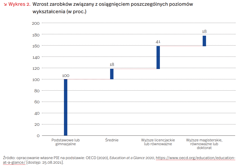 Wyższe wykształcenie wciąż przekłada się na wyższe zarobki oraz skutecznie chroni przed bezrobociem. Wskaźnik zatrudnienia wśród osób w wieku 25-34 lata z wykształceniem niższym niż średnie wynosi 45,2 proc., 69,5 proc. wśród osób z wykształceniem średnim oraz 88 proc. wśród osób z wykształceniem wyższym. Równocześnie wraz ze wzrostem wykształcenia rośnie spodziewana wysokość zarobków. W populacji osób w wieku 25-64 lata zarobki osób z wykształceniem średnim (ponadgimnazjalnym lub policealnym) są średnio o 18 proc. wyższe niż osób, które nie mają średniego wykształcenia. Z kolei osoby z wyższym wykształceniem licencjackim zarabiają średnio o 41 proc. więcej niż osoby ze średnim wykształceniem, a osoby z tytułem magistra lub równorzędnym o 18 proc. więcej niż osoby z licencjatem lub tytułem równoważnym.