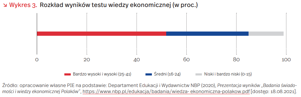 Jak dowiadujemy się z Badania świadomości i wiedzy ekonomicznej Polaków przeprowadzonego przez Narodowy Bank Polski w 2020 r., edukacja ekonomiczna w naszym kraju nie jest na najgorszym poziomie. Wiedzę wysoką i bardzo wysoką ma w sumie 52 proc. Polaków, zaś niską i bardzo niską jedynie 14 proc. Potwierdza to też raport OECD z tego samego roku, w którym Polska plasuje się na 7. miejscu (ex aequo z Portugalią) pośród 26 państw uwzględnionych w rankingu, uzyskując wynik 13,1 pkt. w financial literacy (kategorii uwzględniającej znajomość podstawowych zagadnień ekonomicznych, zachowania w zakresie wydatkowania i oszczędzania posiadanych środków oraz zarządzania nimi, a także postawy wobec oszczędzania i wydawania).