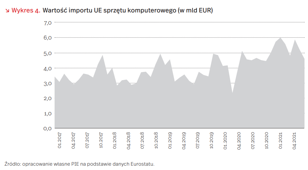 Wartości importu UE utrzymywały się na rekordowych poziomach od listopada 2020 r. do kwietnia 2021 r. Najwyższą wartość import sprzętu komputerowego osiągnął w listopadzie 2020 r., kiedy wyniósł 6,1 mld EUR. Z kolei najwyższe tempo wzrostu importu sprzętu komputerowego zanotowano w lutym 2021 r., kiedy wartość r/r podwoiła się. To pokazuje skalę zwiększonego zapotrzebowania na urządzenia ICT (a w związku z tym też na komponenty) poza zwykłym okresem wzmożonych zakupów tego rodzaju (październik-grudzień). Jest to jeden z czynników, który wpłynął na niedobory półprzewodników i mikroprocesorów na rynku globalnym.