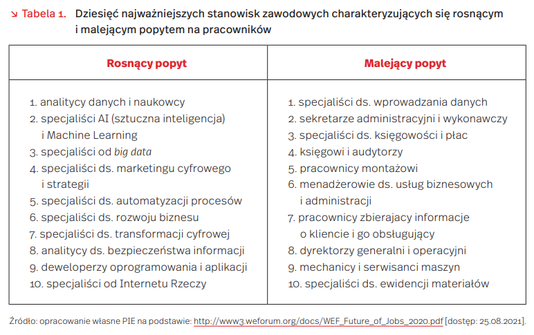 Według raportu Światowego Forum Ekonomicznego, utrzyma się dotychczasowe tempo wdrażania nowych technologii, a w takich działaniach, jak przetwarzanie w chmurze, big data i e-commerce może nawet ulec przyspieszeniu. Maszyny już przewyższają ludzi w wykonywaniu rutynowych działań, ale nie tych, które wymagają kreatywności, inteligencji społecznej i twórczej, czyli kompetencji miękkich. Według pracodawców, do 2025 r. Rosnący popyt Malejący popyt 1. analitycy danych i naukowcy 2. specjaliści AI (sztuczna inteligencja) i Machine Learning 3. specjaliści od big data 4. specjaliści ds. marketingu cyfrowego i strategii 5. specjaliści ds. automatyzacji procesów 6. specjaliści ds. rozwoju biznesu 7. specjaliści ds. transformacji cyfrowej 8. analitycy ds. bezpieczeństwa informacji 9. deweloperzy oprogramowania i aplikacji 10. specjaliści od Internetu Rzeczy 1. specjaliści ds. wprowadzania danych 2. sekretarze administracyjni i wykonawczy 3. specjaliści ds. księgowości i płac 4. księgowi i audytorzy 5. pracownicy montażowi 6. menadżerowie ds. usług biznesowych i administracji 7. pracownicy zbierajacy informacje o kliencie i go obsługujący 8. dyrektorzy generalni i operacyjni 9. mechanicy i serwisanci maszyn 10. specjaliści ds. ewidencji materiałów 9 Tygodnik Gospodarczy PIE 26 sierpnia 2021 r. rosnąć będzie znaczenie takich kompetencji pracowniczych, jak: analityczne myślenie i innowacyjność, kreatywność, zdolność krytycznego myślenia, umiejętność zarządzania zespołem, aktywnego uczenia się i kompleksowego rozwiązywania problemów, odporność na stres, elastyczność oraz oryginalność i pomysłowość.