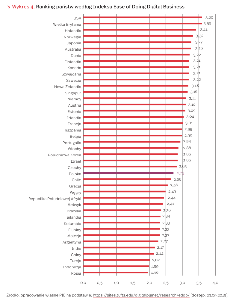 Wszyscy znamy ranking Banku Światowego Doing Business. Badacze z Tufts University opracowali podobne zestawienie, by odpowiedzieć na pytanie: jak łatwo platformom cyfrowym wchodzić, działać i rozwijać się na krajowych rynkach? Stworzyli indeks Ease of Doing Digital Business [13] i ocenili 42 państwa. Pierwsze trzy miejsca zajęły: Stany Zjednoczone, Wielka Brytania i Holandia. Polska znalazła się na 26. miejscu w zestawieniu, które zamykają Chiny, Turcja, Indonezja i Rosja.