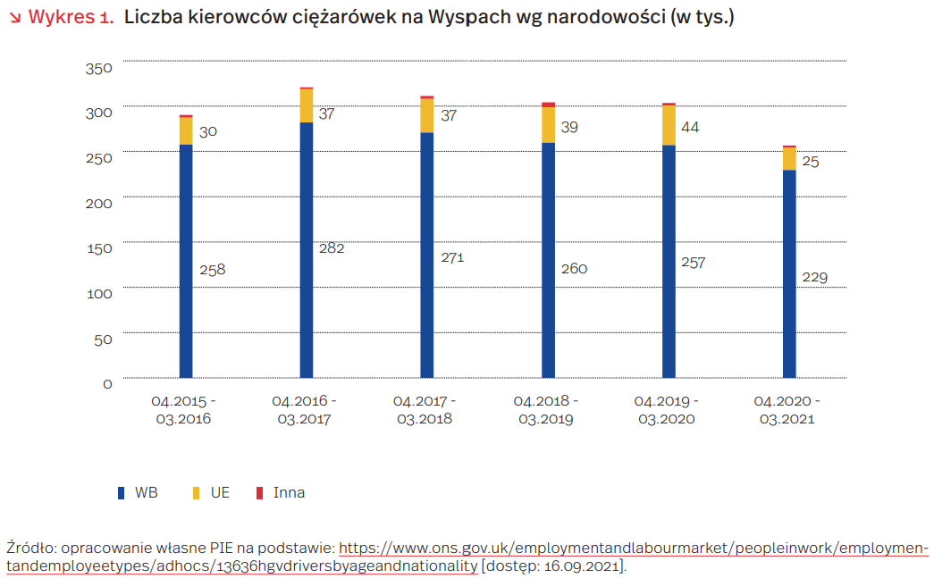 Brexit dodatkowo powiększył braki siły roboczej. Dotychczas niedobory na krajowym rynku pracy były uzupełniane imigrantami z Europy Środkowo-Wschodniej, w tym z Polski. Według wyliczeń Institute for Public Policy Research, 20 proc. pracowników w sektorze transportowym w Wielkiej Brytanii pochodziło z UE. Był to drugi najwyższy wynik spośród wszystkich branż, ustępujący jedynie produkcji żywności. Jednak brexit utrudnia sytuację. W nowym systemie imigracyjnym ponad 80 proc. dotychczasowych pracowników z UE w sektorze transportowym może nie być uprawnionych do wizy dla wykwalifikowanych pracowników.