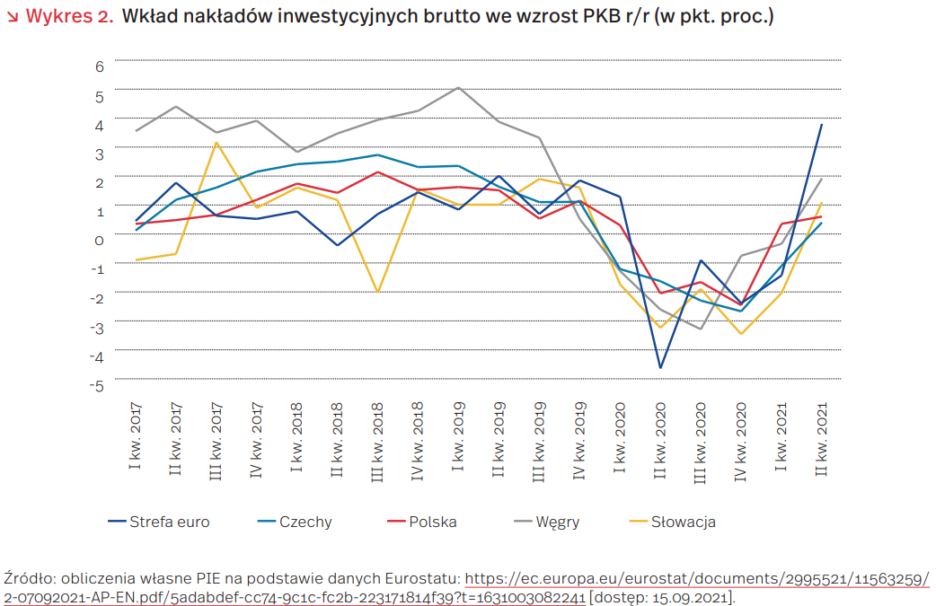 W krajach Grupy Wyszehradzkiej skala zarówno spadku, jak i odbicia inwestycji była na ogół mniejsza niż w strefie euro. W II kw. w Polsce nakłady inwestycyjne były wyższe o 3,5 proc. niż rok wcześniej, ale o 8 proc. niższe niż w II kw. 2019 r. Podobne wyniki odnotowały także inne państwa naszego regionu: Czechy, Słowacja i Węgry. Oczekiwania przyspieszenia inwestycji w kolejnych kwartałach można wiązać z poprawą ocen przyszłej koniunktury, redukcją niepewności co do średniookresowego kształtu polityki pieniężnej oraz uruchomieniem unijnego Planu Odbudowy (NextGenerationEU).