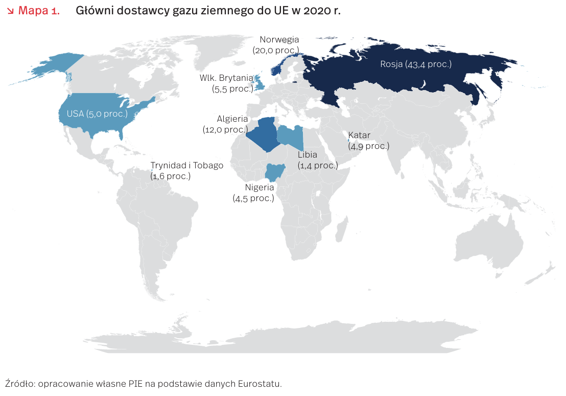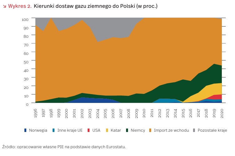 W imporcie gazu do Polski nadal dominuje kierunek wschodni. Jednak w ostatnich dwóch dekadach jego udział w imporcie zmalał o ok. 1/4 do 55 proc. Jeszcze do 1996 r. ponad 99 proc. importowanego gazu pochodziło z Rosji. Następnie swój udział w eksporcie do Polski miały Niemcy. Do końca XX wieku import z Ukrainy kilkukrotnie oscylował wokół 15 proc. Od 2000 r. w imporcie zaczął pojawiać się gaz norweski i z kilku innych republik ZSRR: Uzbekistanu, Turkmenistanu i Kazachstanu. W połowie 2016 r. pierwsze dostawy gazu LNG przyjęto w terminalu regazyfikacji w Świnoujściu, a w ostatnich latach pojawił się import LNG (liquified natural gas) z Kataru i Stanów Zjednoczonych, a także w mniejszym stopniu z Norwegii. W 2020 r. łącznie udział LNG wyniósł ok. 20 proc. [3].