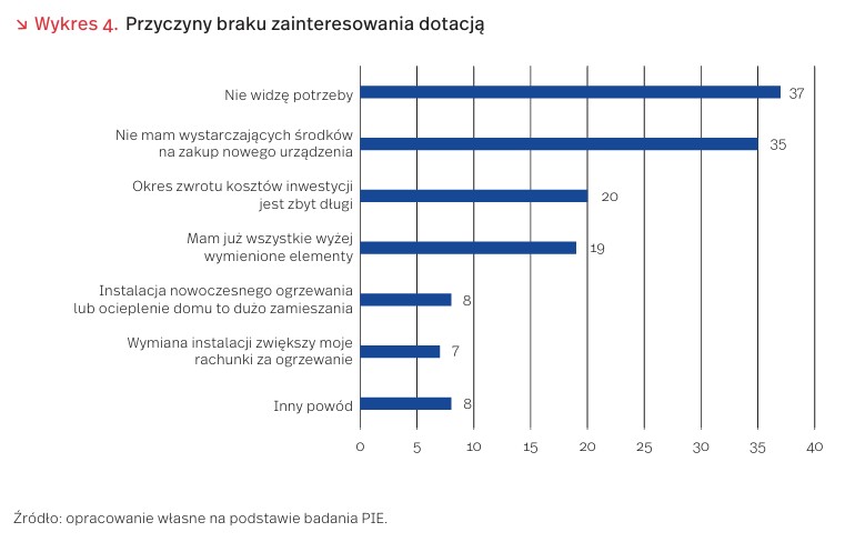 Według danych z badań PIE, przeprowadzonych w okresie stabilnych cen gazu (2020 r.), osoby niezainteresowane skorzystaniem z programu Czyste Powietrze jako uzasadnienie takiej postawy wymieniały obawę przed wyższymi rachunkami (u 7 proc. ankietowanych) lub długim czasem oczekiwania na zwrot z takiej inwestycji przy niższych opłatach (u 20 proc.) (wykres 4). W warunkach wzrostu cen gazu oba czynniki zniechęcające do skorzystania z dopłaty zyskują na znaczeniu. Perspektywa wyższych rachunków sprawia, że modernizację energetyczną uznaje się za mniej opłacalną. Bezpośrednim efektem wzrostu cen gazu może być spadek zainteresowania dotacjami na kotły gazowe w ramach programu Czyste Powietrze i podobnych programów samorządowych.