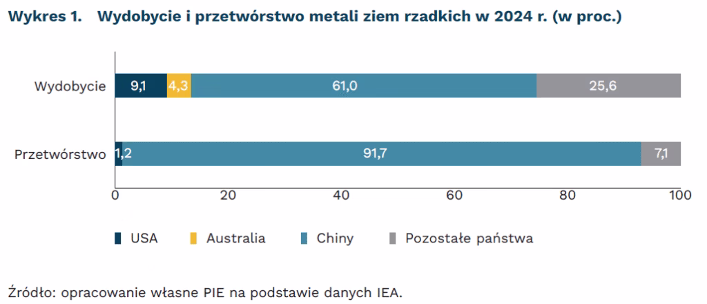 Brakuje prostej alternatywy dla importu przetworzonych metali ziem rzadkich. Chiny zmonopolizowały zarówno produkcję (61 proc. w 2024 r.), jak i przetwórstwo (92 proc.) REE. Sytuacja ta dotyczy też przetwórstwa litu, miedzi i grafitu. Znaczna część tej produkcji trafia na rynek chiński, na którym jest przetwarzana w dobra finalne przeznaczone na rynek wewnętrzny lub na eksport, np. akumulatory elektryczne. Zmniejszenie dostępu do technologii wydobycia i przetwórstwa chińskich REE może utrudnić wdrożenie inicjatyw, m.in. przez USA, uniezależniających łańcuch dostaw od Chin. W 2024 r. analiza zależności UE wykazała 64 produkty krytycznie zależne w imporcie bezpośrednio od Chin, których łączna wartość odpowiada za ok. 5 proc. importu spoza UE, m.in. metali ziem rzadkich czy paneli fotowoltaicznych. W 2023 r. Polska odnotowała 30 krytycznych zależności w imporcie z Chin, odpowiadających za 0,15 proc. polskiego importu, m.in. magnez, molibden, urządzenia destylacyjne i rektyfikacyjne czy rutyna.