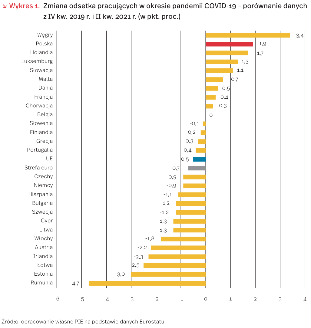 Według danych Eurostatu, w Polsce, w porównaniu z innymi krajami UE, nastąpił jeden z największych wzrostów wskaźnika zatrudnienia – o 1,9 pkt. proc. Większy zanotowano jedynie na Węgrzech (+3,4 pkt. proc.), natomiast największy spadek miał miejsce w Estonii (-4,7 pkt. proc.). Biorąc pod uwagę wartości liczbowe, w całej UE pod koniec II kw. 2021 r. pracowało o 2,98 mln osób mniej niż przed pandemią. Największe spadki zatrudnienia wystąpiły w Niemczech (-1012 tys. osób), Włoszech (-826 tys. osób) i Rumunii (-738 tys. osób), a najwyższe wzrosty – w Holandii (+227 tys. osób), Polsce (+150 tys. osób) i na Węgrzech (+121 tys. osób).