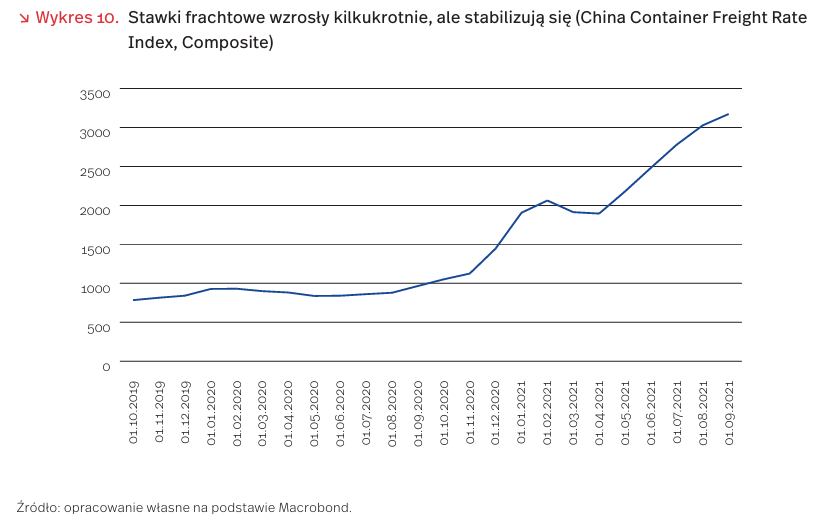 Cena frachtu jest obecnie ponad ośmiokrotnie wyższa niż przed pandemią [9]. Właśnie rok temu, wraz ze wzmożonym popytem na towary w trakcie drugiej fali pandemii COVID-19 i przed okresem świątecznym, rozpoczął się gwałtowny wzrost cen transportu morskiego. Z powodu ograniczonego popytu w pierwszej połowie 2020 r. kontenery zalegały w portach, a statki znalazły się daleko od azjatyckich portów, które były gotowe do wysyłania nowych zamówień. Rynek zareagował bardzo szybko. Ceny frachtu (Freightos Baltic Index), które w październiku 2020 r. były już o 80 proc. wyższe niż w 2019 r., do końca stycznia 2021 r. jeszcze się podwoiły. W okresie styczeń-kwiecień ceny ustabilizowały się, by wraz z odmrożeniem zachodnich gospodarek i ponownymi zamknięciami portów w Chinach od kwietnia 2021 r. ponownie wzrosnąć ponad dwukrotnie. We wrześniu br. indeks był rekordowo wysoki, dziewięciokrotnie przekraczał ceny sprzed pandemii. (MT, ŁB) na możliwość rozładowania towaru. Rekordowa liczba ok. 65 statków oczekiwała na możliwość rozładunku w USA w we wrześniu przed portem w Los Angeles i Long Beach [10]. Czas dostaw wydłużył się ponad dwukrotnie, co zmniejsza liczbę dostępnych do użytku kontenerów.