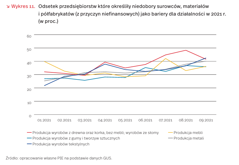 Wśród przedsiębiorstw przemysłowych ogółem w Polsce we wrześniu br. 23,2 proc. ankietowanych firm w badaniu koniunktury GUS postrzegało niedobory surowców, materiałów i półfabrykatów (z przyczyn niefinansowych) jako bariery działalności. Udział ten wzrasta od początku roku. Według badania, niedoborami surowców w największym stopniu dotknięte są branże związane z produkcją wyrobów tekstylnych, wyrobów z drewna, mebli, metali i wyrobów z gumy i tworzyw sztucznych (po ok. 40 proc. w każdej branży) [18].
