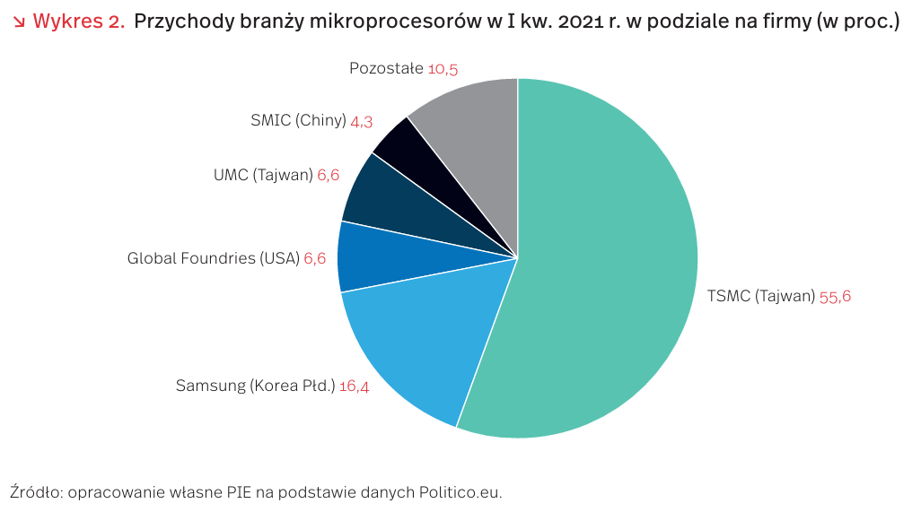 Produkcja mikroprocesorów stanowi obecnie jeden z najbardziej zaawansowanych technologicznie rodzajów przemysłu, a jednocześnie pozostaje silnie zdominowana przez dwie największe firmy (TSMC i Samsung). Mikroprocesor to układ scalony o wysokim stopniu integracji, zbudowany z miniaturowych tranzystorów – półprzewodników. Rozwój wysokich technologii przez ostatnie 50 lat możliwy był dzięki błyskawicznej miniaturyzacji tranzystorów (co 1,5 roku podwaja się poziom złożoności mikroprocesorów). Tak szybki wyścig spowodował jednak, że tylko pojedyncze fabryki są w stanie produkować najnowocześniejsze półprzewodniki, a inne szukają wąskich specjalizacji w łańcuchu wartości. Monopolistą w obszarze dostarczania wysoko zaawansowanych maszyn potrzebnych do produkcji mikroprocesorów jest holenderska spółka ASML, która z kolei bazuje m.in. na komponentach niemieckich (Carl Zeiss, Trumpf). W obszarze komponentów do produkcji (m.in. wafle krzemowe, z których tworzone są mikroprocesory) dominującą rolę odgrywają natomiast dwie japońskie firmy (Shin-Etsu Chemical, Sumco).