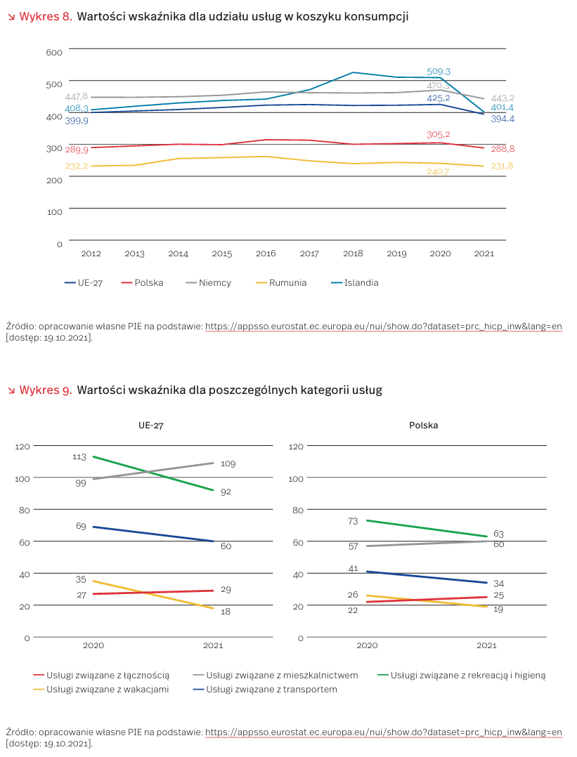 W 2021 r. w Polsce odnotowano spadek korzystania przez gospodarstwa domowe z usług na rzecz towarów. Wagi HICP [8] dla 2021 r. zaktualizowane do wartości koszyka konsumpcji z 2020 r. wskazują na spadek wskaźnika dla usług do poziomu 289 w 2021 r. z 305 w 2020 r., co stanowi odwrócenie dotychczasowego, rosnącego trendu. Obniżenie udziału usług w konsumpcji dotknęło wszystkie kraje (PŚ, ŁB) UE, przy czym największe spadki odnotowano w Islandii i Irlandii, a najmniejsze w Rumunii i w Polsce, w których dotychczas udział usług w konsumpcji był na relatywnie niskim poziomie (wykres 8).