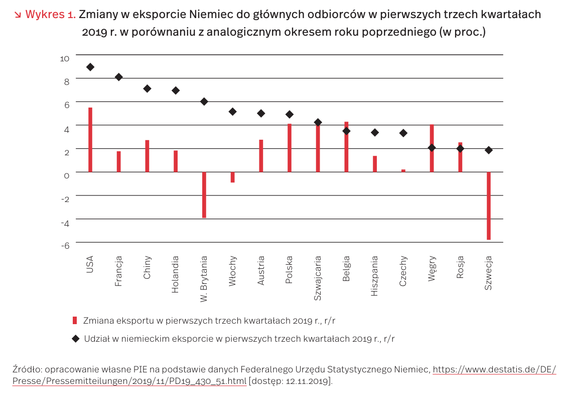 Do spowolnienia dynamiki niemieckiego eksportu w pierwszych trzech kwartałach 2019 r. przyczynił się spadek zagranicznego popytu na towary mające duże znaczenie w strukturze tego eksportu. O 3,9 proc. r/r zmalał eksport leków i wyrobów farmaceutycznych, o 2,4 proc. r/r eksport samochodów i części motoryzacyjnych, a o 1,4 proc. r/r – artykułów z tworzyw sztucznych. Niepokojący dla polskich producentów wydaje się spadek popytu na niemieckie samochody na rynkach zagranicznych, gdyż duża część tych producentów jest dostawcami części i podzespołów dla niemieckich fabryk. Według wyliczeń Polskiego Instytutu Ekonomicznego, blisko 1/3 eksportu polskiego przemysłu motoryzacyjnego trafia właśnie do Niemiec.