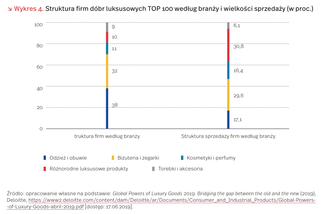 Z raportu Deloitte pt. Global Powers of Luxury Goods 2019. Bridging the gap between the old and the new [7] wynika, że największe światowe firmy rynku dóbr luksusowych odnotowały w 2017 r. wysoką dynamikę sprzedaży ekskluzywnej odzieży, torebek i akcesoriów, biżuterii i zegarków oraz kosmetyków i perfum [8]. Sprzedaż 100 największych światowych firm z rynku dóbr luksusowych w 2017 r. [9] wyniosła łącznie 247 mld USD i była wyższa o 10,8 proc. w porównaniu z poprzednim rokiem obrotowym. Pierwsza dziesiątka firm dóbr luksusowych odnotowała wyższy wzrost sprzedaży (14,2 proc.) niż łącznie przedsiębiorstwa TOP 100 i wygenerowała 48,2 proc. sprzedaży pierwszej setki firm.