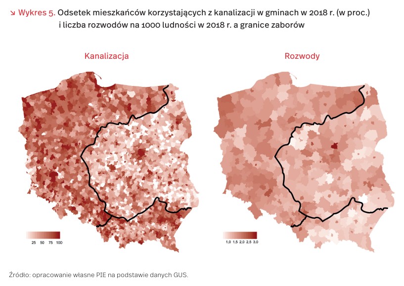 Gdy 11 listopada 1918 r. marszałek Ferdinand Foch przebywający w okolicach Compiègne podpisał rozejm z Cesarstwem Niemieckim, zakończyła się I wojna światowa, a dla Polaków trwające 123 lata zabory. Chociaż minęło już 101 lat od tamtych wydarzeń, to dawne granice historyczne są widoczne nie tylko na kartach podręczników, ale również we współczesnych danych. Widać je zarówno we wskaźnikach infrastrukturalnych, np. odsetku mieszkańców gmin korzystających z kanalizacji, jak i społecznych, np. liczbie rozwodów na 1000 mieszkańców powiatu.