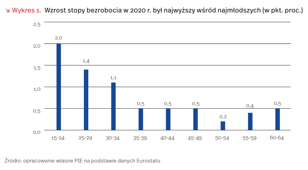 W czasie kryzysu covidowego najwyższy wzrost stopy bezrobocia odnotowano wśród osób młodych. W całej Unii Europejskiej w 2020 r. stopa bezrobocia wśród młodych, a więc osób w wieku 15-24 lat, wzrosła o 2 pkt. proc. – z poziomu 14,8 proc. do 16,8 proc. W starszych kohortach wiekowych przyrost stopy bezrobocia był mniejszy i malał wraz z wiekiem (wykres 1). Wśród osób w wieku 50-54 lat stopa bezrobocia wzrosła minimalnie – o 0,2 pkt. proc.