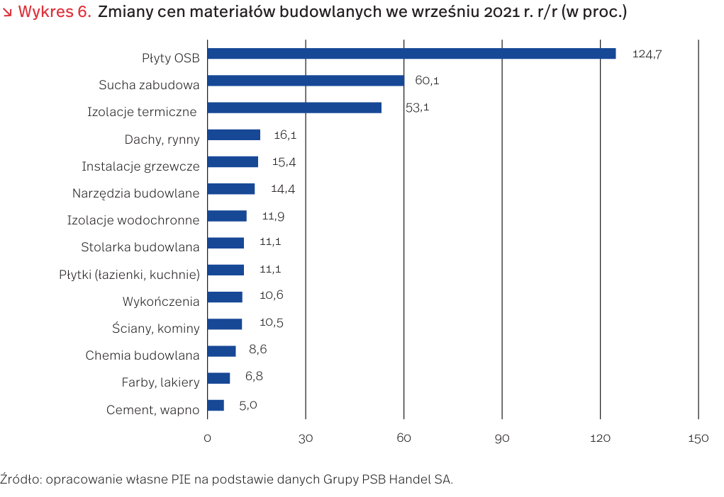Z badań koniunktury GUS wynika, że od kwietnia do sierpnia 2021 r. najbardziej uciążliwy dla firm budowlanych był koszt materiałów budowlanych. W składach i hurtowniach Polskich Składów Budowlanych we wrześniu 2021 r. ceny materiałów budowlanych były średnio o 21,7 proc. wyższe niż rok wcześniej. Ceny płyt OSB wzrosły aż o 124,7 proc., a suchej zabudowy i izolacji termicznych o ponad 50 proc. (wykres 6) [6]. Wzrost ten wynika z opóźnień i zmniejszenia dostaw materiałów budowlanych z Chin, ale też wzrostu cen paliw, energii i wynagrodzeń. Problemem dla firm budowlanych jest także dostępność materiałów budowlanych. Dawniej były one dostępne od ręki, a teraz trzeba czekać na nie tydzień lub dwa, co może się odbić na terminie realizacji inwestycji [7].