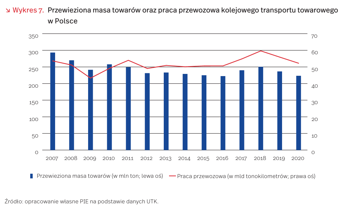 Masa towarów przewieziona za pomocą transportu kolejowego w Polsce w 2020 r. osiągnęła najniższy poziom od 2016 r. – 223 mln t (250 mln t w 2018 r. i 236 mln t w 2019 r.). W latach 2018-2020 o 12 proc. spadła także liczba tonokilometrów [15] kolejowego przewozu towarów – z blisko 60 mld w 2018 r. do 52 mld w 2020 r.
