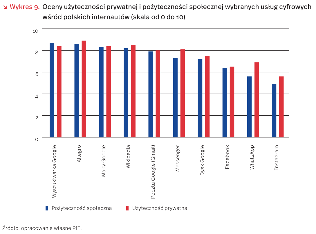 W przeprowadzonym na przełomie września i października badaniu społecznym PIE poprosił respondentów m.in. o ocenę wybranych usług internetowych w dwóch wymiarach – osobistej użyteczności oraz społecznej pożyteczności. W każdym przypadku możliwe były odpowiedzi od 0 (bezużyteczna, szkodliwa społecznie) do 10 (bardzo użyteczna, bardzo pożyteczna społecznie) [23]. Zarówno w pytaniu o społeczną użyteczność, jak i o użyteczność dla użytkownika, stawkę zamykały Facebook, WhatsApp i Instagram.