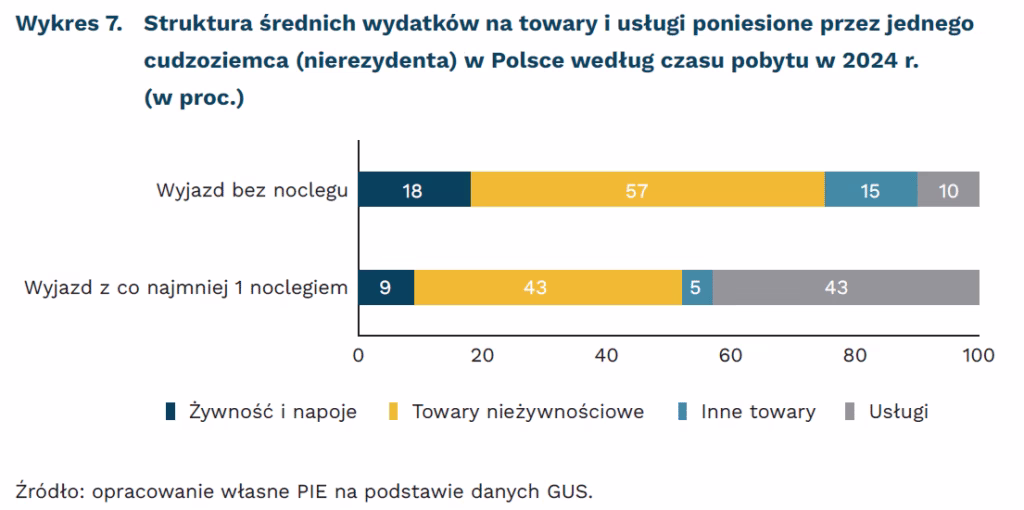 Polska ciągle pozostaje atrakcyjnym celem zakupowym dla cudzoziemców, szczególnie z krajów sąsiednich. W ramach małego ruchu granicznego zakupy w pasie do 50 km od granicy generują obroty mające znaczenie dla lokalnych gospodarek przygranicznych. Jednak w perspektywie całej gospodarki ważne są rosnące wydatki cudzoziemców przyjeżdżających na dłużej, bo one świadczą o potencjale rozwoju usług turystycznych i biznesowych w Polsce. Wprawdzie polscy turyści więcej pieniędzy zostawiają za granicą niż w kraju, ale ich średnie wydatki na osobę, która przekroczyła granicę w 2024 r. (494 PLN) były i tak niższe niż te, które zostawili w Polsce zagraniczni turyści (585 PLN).