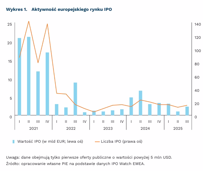 W III kwartale europejski rynek IPO (pierwszych ofert publicznych) odnotował ożywienie. Liczba ofert zwiększyła się do 15, a ich łączna wartość wyniosła 2,3 mld EUR. Jest to wyraźny wzrost względem poprzedniego kwartału, gdy odnotowano 12 ofert o łącznej wartości 1 mld EUR. Na czele jest oferta Swiss Marketplace Group AG na giełdzie w Zurychu o wartości 967 mln EUR, wspierana przez szereg dużych transakcji ze Szwecji, Hiszpanii i Niemiec. Wzrost wartości ofert to pozytywny sygnał odbudowy zaufania inwestorów na europejskich rynkach, na których obecnie trwa rotacja sektorowa – największa liczba ofert należy do sektorów nieruchomości, hotelarstwa i budownictwa. Jednocześnie sektor finansowy nabiera tempa, podczas gdy technologiczny nadal dominuje pod względem wartości pozyskanych środków. Jednak mimo oznak ożywienia, europejskie IPO nadal napotykają istotne bariery, zwłaszcza wynikające z napięć geopolitycznych i niepewności gospodarczej.