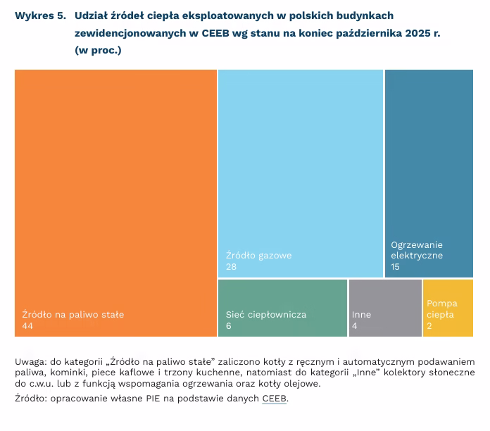 44 proc. źródeł ciepła użytkowanych w budynkach zewidencjonowanych w bazie CEEB stanowią emisyjne urządzenia na paliwa stałe