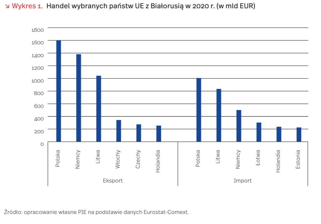 Ewentualne zamknięcie polsko-białoruskiej granicy dla ruchu towarowego byłoby bardziej kosztowne dla strony białoruskiej i rodziło problemy także dla Federacji Rosyjskiej. Białoruś wyróżnia się dużym, 70 proc., udziałem eksportu w PKB (średnia w UE to 47 proc.). Najważniejszym źródłem dochodów Białorusi jest eksport produktów ropopochodnych, takich jak paliwa i smary. Unia Europejska odpowiadała w 2020 r. za niemal 20 proc. wymiany handlowej Białorusi i mimo sankcji nałożonych na reżim Łukaszenki jest dla niej drugim po Rosji partnerem handlowym. Największe znaczenie w eksporcie białoruskim do UE miały: ropa i produkty ropopochodne (ok. 20 proc. eksportu Białorusi), drewno i produkty z drewna (18 proc.), nawozy (7 proc.). W przypadku zamknięcia granicy, część handlu z państwami UE odbywałaby się prawdopodobnie przez państwa trzecie (m.in. Rosję, Ukrainę). Ewentualne zamknięcie granicy lądowej z Białorusią przez państwa UE to drastyczny scenariusz możliwy w przypadku dalszej eskalacji kryzysu na polsko-białoruskiej granicy.