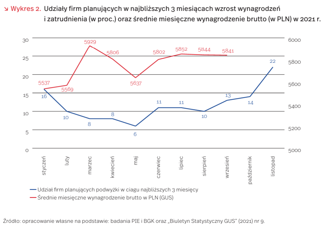Według badań na potrzeby MIK [4] (realizowanych przez PIE i BGK), udział firm planujących podwyżki w najbliższych 3 miesiącach rósł od czerwca, a w listopadzie osiągnął rekordowe 22 proc. (wykres 2). Jednocześnie tendencja wzrostowa udziału firm, które zamierzają zwiększyć zatrudnienie uległa odwróceniu w sierpniu – coraz mniej firm planowało przyjęcie nowych osób. Nie można tego wiązać tylko z sezonowym zmniejszeniem zapotrzebowania na pracowników. Firmy, zdając sobie sprawę z ograniczonych możliwości pozyskiwania nowych pracowników, postanowiły przede wszystkim utrzymać już posiadanych zwiększając im wynagrodzenia.