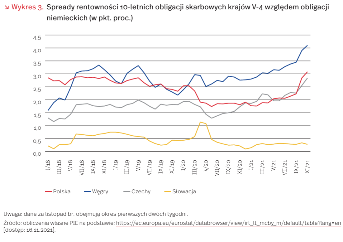Rośnie różnica między oprocentowaniem obligacji państw Grupy Wyszehradzkiej (V-4) a oprocentowaniem obligacji niemieckich. W trakcie pierwszych fal kryzysu pandemicznego polskie długookresowe obligacje skarbowe relatywnie zyskały wobec niemieckich ze względu na skuteczne hamowanie tendencji recesyjnych w gospodarce. W ostatnich miesiącach spread jednak wzrósł, zbliżając się do poziomów z lat 2018-2019. Podobnie, a nawet bardziej dynamicznie, podnoszą się obecnie spready obligacji węgierskich i czeskich. Tylko w odniesieniu do słowackich nie widać tego profilu zmian rentowności (wykres 3).