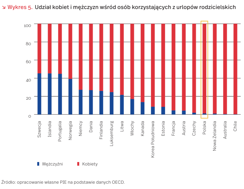 W większości państw OECD istnieje daleko posunięta asymetria zaangażowania ojców i matek w opiekę nad dziećmi i obowiązki domowe. Według ostatnich dostępnych danych międzynarodowych za 2016 r., mężczyźni stanowią średnio zaledwie 18 proc. beneficjentów (rodziców) korzystających z urlopów rodzicielskich. Najwięcej mężczyzn, bo ponad 40 proc., korzysta z urlopów rodzicielskich w Szwecji, na Islandii i w Portugalii (wykres 5). W Polsce udział mężczyzn wśród osób, które korzystały w 2020 r. z urlopów rodzicielskich wynosi 1 proc. Podobną asymetrię widać było również w czasie pandemii. Według danych ZUS, w Polsce kobiety stanowiły 70 proc. osób korzystających z zasiłku opiekuńczego.