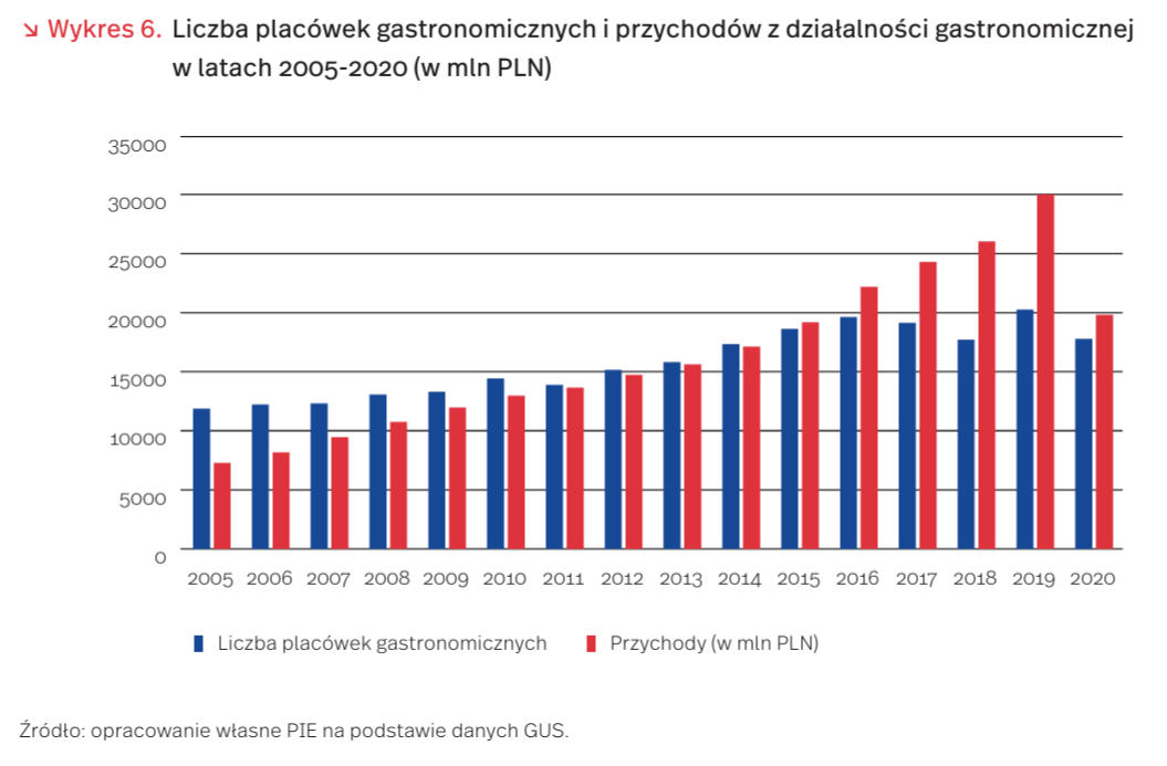 W 2020 r. do 9,5 mld (czyli o 42 proc. w stosunku do 2019 r.) zwiększył się rynek dowozów jedzenia w Polsce – według danych firmy Stava. Według danych GUS, przychody z działalności gastronomicznej w 2020 r. wyniosły 19,8 mld PLN (spadek o 34 proc. w stosunku do 2019 r.). Oznacza to, że rynek dostaw jedzenia stanowił w 2020 r. 48 proc. całości rynku gastronomicznego (warto zaznaczyć, że przez ok. 5 miesięcy nie wolno było spożywać posiłków w restauracjach). Na tym rozwoju korzystały w pierwszej kolejności zagraniczne platformy służące do obsługi zamówień i dostaw jedzenia. Według szacunkowych danych firmy Stava [14], największe dwie aplikacje (należące do holenderskiej grupy kapitałowej Pyszne.pl i amerykański Uber) obsłużyły ok. 55 proc. dostaw.