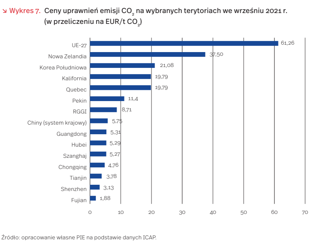 Ceny uprawnień do emisji tony CO2 w UE we wrześniu 2021 r. wyniosły ok. 61 EUR/t, co znacząco przewyższało ceny w innych krajach lub terytoriach, które stosują podobne systemy. W ogólnokrajowym systemie chińskim były one ponad 10-krotnie niższe (5,75 EUR/t) a dla USA od 7-krotnie (stany zrzeszone w RGGI – 8,71 EUR/t) do 3-krotnie niższe (Kalifornia – 19,79 EUR/t) w porównaniu do cen EU ETS. Poszczególne systemy różnią się między sobą m.in. pokryciem całości emisji na danym terytorium – od ok. 10 proc. (RGGI) do 70-80 proc. (Korea Płd., Kalifornia, Nowa Szkocja) [23]. Część systemów, jak np. chiński ogólnokrajowy system handlu emisjami uwzględnia jedynie CO2 nie biorąc pod uwagę innych gazów cieplarnianych. W UE-27 system ETS obejmuje także emisje NO2 oraz Perfluorowęglowodorów jako ekwiwalentu CO2