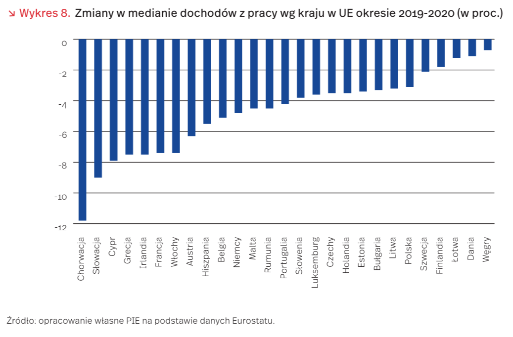 Problem cięcia wynagrodzeń w pandemii dotknął wielu pracowników. Jak pokazują dane z różnych krajów, w szczytowym momencie I fali, na wiosnę 2020 r., na taki manewr zdecydowało się 14 proc. przedsiębiorstw w Polsce, a wśród średnich firm więcej niż co piąta (22 proc.) [27]. Z kolei z badań PIE Portugalia Słowenia Luksemburg Czechy Holandia Estonia Bułgaria Litwa Polska Szwecja Finlandia Łotwa Dania Węgry obejmujących polskich eksporterów z sektora przemysłowego wynika, że obniżki wynagrodzeń, jako działanie podtrzymujące kondycję ekonomiczno-finansową firmy w pandemii, zastosowało 20 proc. z nich, przy czym na cięcia zdecydowało się aż 28 proc. spośród przebadanych dużych przedsiębiorstw. Patrząc na sytuację pracowników w krajach UE można stwierdzić, że w 2020 r., w porównaniu do 2019 r., doświadczyli oni spadku dochodów w wysokości ok. 5 proc. łącznych zarobków, a dochód rozporządzalny pozostawał stabilny głównie dzięki tarczom antykryzysowym wprowadzanym przez rządy [28]. Zmiany w poszczególnych krajach wahały się od -12 proc. do -1 proc., z największymi stratami poniesionymi przez pracowników chorwackich, zaś najmniejszymi przez węgierskich.