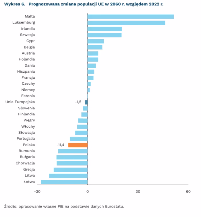 Sytuacja demograficzna w UE jest zróżnicowania. Liczba ludności w całej UE do 2060 r. zmniejszy się o 1,5 proc. względem 2022 r. W Polsce będzie to 11,36 proc., co wskazuje zbliżony spadek do notowanego w Portugalii.
