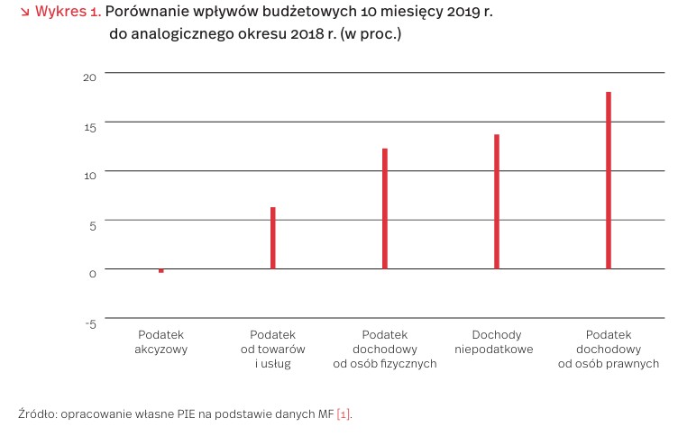 Największy przyrost wpływów odnotowano w podatku dochodowym od osób prawnych. W porównaniu z okresem I-X 2018 r., w 2019 r. o 18 proc. wzrosły wpływy z podatku dochodowego od osób prawnych (CIT), osiągając 34 mld PLN (czyli 97,8 proc. planu budżetowego na ten rok). Wzrosły także dochody z podatku dochodowego od osób fizycznych o 12 proc. oraz w mniejszym stopniu dochody z podatku od towarów i usług (o 6 proc.)