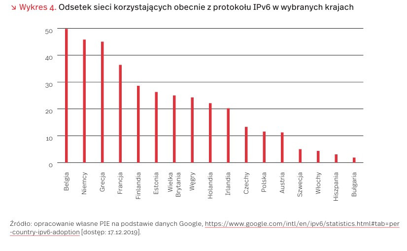 Wykorzystanie IPv6 w sieciach jest bardzo zróżnicowane w poszczególnych krajach. W Europie liderami są Belgia, Niemcy i Grecja, ale nawet tam wykorzystanie nowego protokołu nie przekracza 50 proc. W Polsce z IPv6 korzysta obecnie ok. 11,5 proc. sieci. →IPv6 jest docelowym standardem, który zapewni dalszy, harmonijny rozwój internetu. Póki co jednak firmy w ograniczonym stopniu z niego korzystają. Mimo początkowych kosztów, pełniejsze wdrożenie IPv6 będzie jednak na dłuższą metę korzystne zarówno dla samych firm, jak i dla całego ekosystemu internetowego.