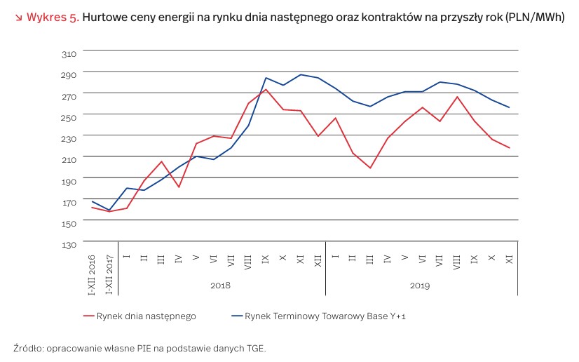 Wzrost cen energii ma swoje uzasadnienie gospodarcze. Znacząco wzrosły koszty zakupu certyfikatów na emisję CO2 (European Emission Allowances – EUA). Na początku 2018 r. cena jednego certyfikatu na giełdzie wynosiła poniżej 10 EUR za tonę, podczas gdy w drugiej połowie 2019 r. oscylowała wokół 25 EUR [4]. Przełożyło się to bezpośrednio na rynek hurtowy energii elektrycznej, na którym ceny (zarówno w przypadku kontraktów na dzień następny, jak i na następny rok) już w drugiej połowie 2018 r. wzrosły o ponad 100 PLN/MWh. Mimo późniejszej korekty w dół, ceny energii elektrycznej na rynku hurtowym pozostają znacząco wyższe niż w latach 2016-2017 (wykres 5).