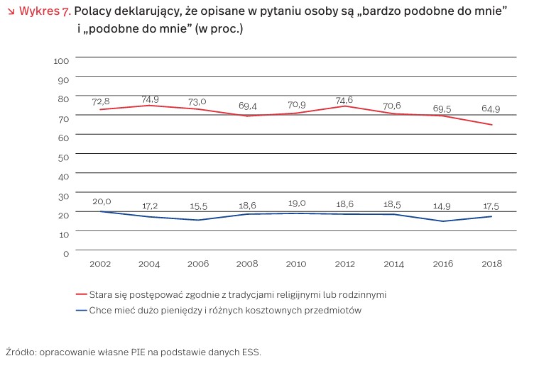 Przez 16 lat wyraźnie – o niemal 8 pkt. proc. – spadł odsetek respondentów deklarujących przywiązanie do tradycji religijnych i rodzinnych. Wciąż jednak ponad 2/3 Polaków biorących udział w badaniu zadeklarowała, że to wartości ważne w ich życiu. Jednocześnie zdecydowanie mniej respondentów z naszego kraju twierdzi, że pieniądze i kosztowne przedmioty są ważne w ich życiu (17,4 proc. w ostatniej fali badania). Odsetek osób deklarujących przywiązanie do wartości materialnych nie zmienia się znacząco na przestrzeni ostatnich niemal dwóch dekad (2,6 pkt. proc. różnicy między latami 2002 a 2018).