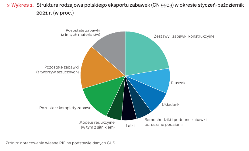 Polska jest 9. światowym eksporterem zabawek klasycznych (CN 9503) z udziałem 1,7 proc. w światowym eksporcie tej grupy towarowej. Liderem na liście są Chiny, zaś z krajów unijnych wyprzedzają nas tylko Czechy, Niemcy i Holandia [1]. W Polsce wciąż produkowane są zabawki, m.in. zestawy i zabawki konstrukcyjne (np. klocki), modele redukcyjne (kopie rzeczywistych obiektów), pluszaki, układanki (z drewna i innych materiałów), samochodziki i podobne zabawki poruszane pedałami oraz lalki. W polskim eksporcie nie wszystkie zabawki są rodzimej produkcji, dynamicznie rośnie też import zabawek, a ich część jest reeksportowana do innych krajów.